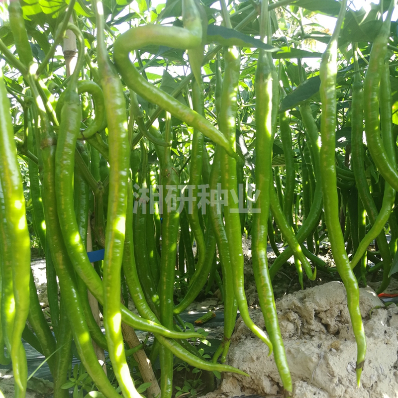 中熟、綠色、順直、長線椒品種,首花節(jié)位9-11節(jié),植株生長勢(shì)強(qiáng),株型緊湊,葉小,果實(shí)順直,綠色轉(zhuǎn)亮紅色,單果重30克,連續(xù)坐果性好,味辣,皮薄,肉質(zhì)脆嫩,品質(zhì)好,綜合抗性強(qiáng);適合青紅鮮椒上市或醬制加工。